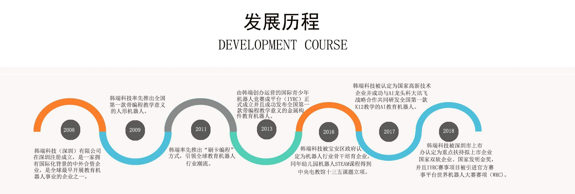 ABOUT US韓端科技(品牌:韓端、MY ROBOT TIME),于2008年在深圳成立,公司根植智能教育硬件賽道已經(jīng)14年之久,是深圳也是中國最早專注于這個(gè)細(xì)分領(lǐng)域的本土品牌之一。公司致力于向海內(nèi)外用戶提供以智能教育機(jī)器人為教學(xué)載體,覆蓋全學(xué)齡段的智能教育硬件產(chǎn)品和課程體系,是中國領(lǐng)先的機(jī)器人和人工智能編程教育產(chǎn)品技術(shù)服務(wù)商,也是我國青少年科學(xué)素質(zhì)教育行業(yè)的拓荒者之一。公司是教育部全國信息技術(shù)標(biāo)準(zhǔn)化技術(shù)委員會單位委員,中國教育技術(shù)協(xié)會人工智能專委會發(fā)起單位、北京大學(xué)學(xué)習(xí)科學(xué)實(shí)驗(yàn)室深度合作單位、國際青少年機(jī)器人協(xié)會(聯(lián)合國NGO理事會觀察員)創(chuàng)始單位。