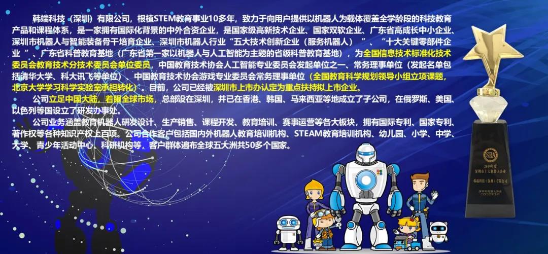 機器人既是先進制造業的關鍵支撐裝備,也是改善人類生活方式的重要切入點。本次企業獲得的榮譽,既是對韓端科技在機器人與人工智能科技教育行業的高度重視,也是對韓端科技多年來努力的肯定!