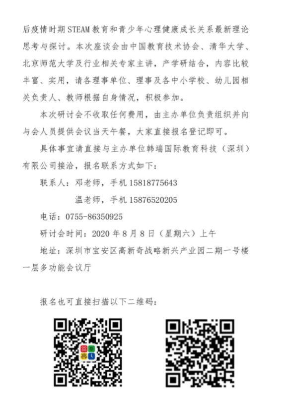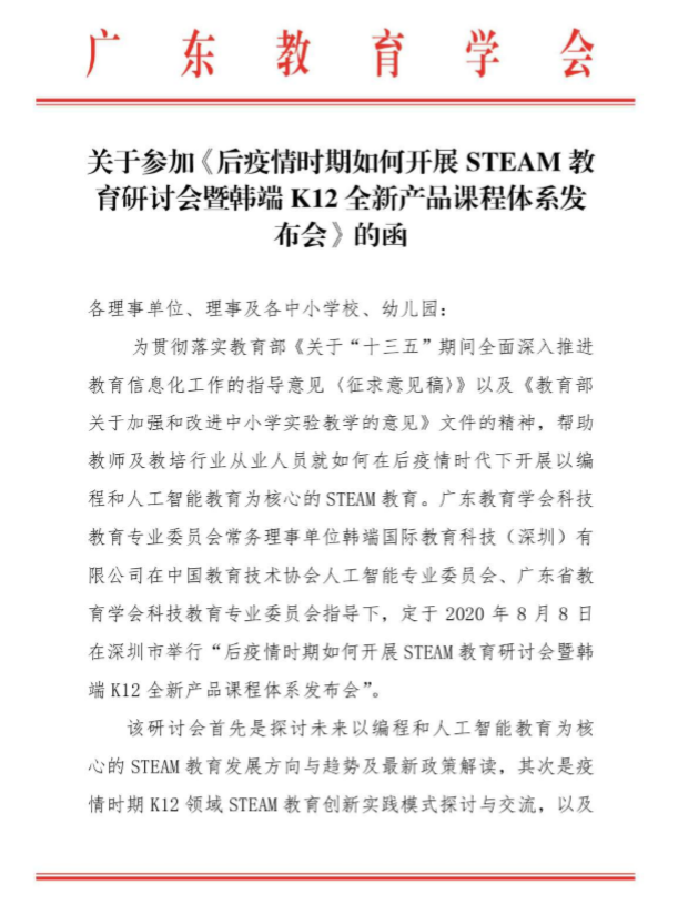 “后疫情時代如何開展STEAM教育研討會暨韓端K12全新課程體系發布會”將于2020年8月8日舉辦,本次大會的主題是“后疫情時代如何開展STEAM教育研討會暨韓端K12全新課程體系發布會”,將圍繞在防疫常態化下人工智能教育、教培機構行業動態、機器人大賽趨勢、教育政策解讀等方面進行深入廣泛的交流。