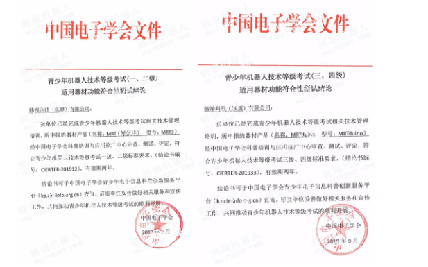 2019年韓端機器人產品經評審被認定為全國青少年機器人技術等級考試符合性器材,以下為電子學會授權文件以及1-2級等級套裝簡介: