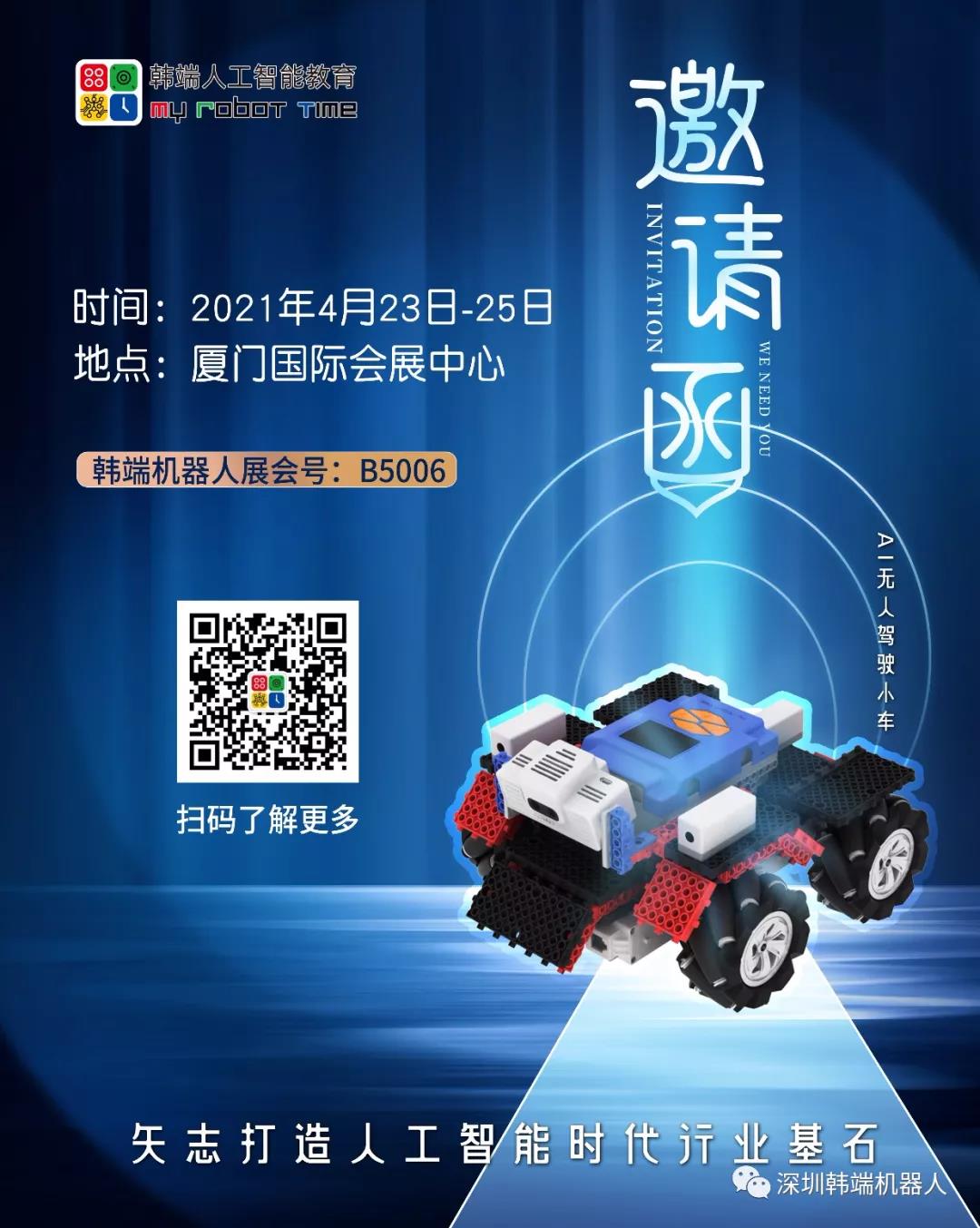 由中國教育裝備行業協會主辦的第79屆中國教育裝備展示會將于2021年4月23日-25日在廈門國際會展中心召開,韓端人工智能教育誠邀您4月23日—25日來廈門國際會展中心蒞臨B5006觀展洽談。