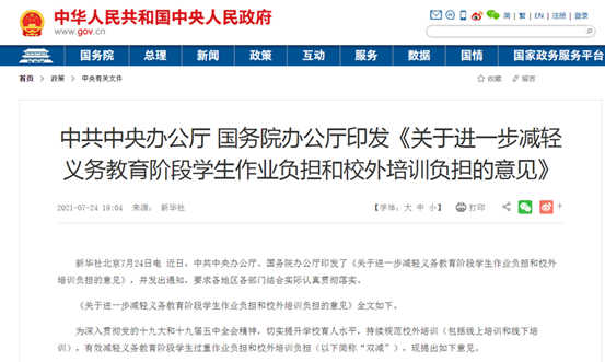 7月24號,中共中央辦公廳、國務(wù)院辦公廳印發(fā)《關(guān)于進(jìn)一步減輕義務(wù)教育階段學(xué)生作業(yè)負(fù)擔(dān)和校外培訓(xùn)負(fù)擔(dān)的意見》(以下簡稱“雙減”意見)并發(fā)出通知,要求各地區(qū)各部門結(jié)合實際認(rèn)真貫徹落實。