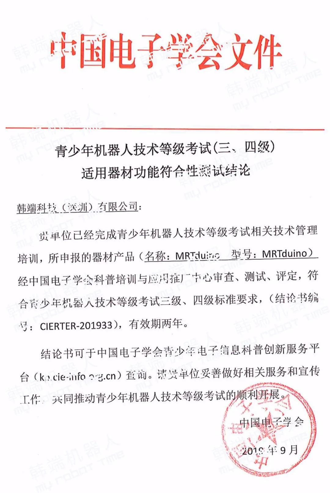 2019年韓端機器人產(chǎn)品經(jīng)評審被認(rèn)定為全國青少年機器人技術(shù)等級考試符合性器材,以下為電子學(xué)會授權(quán)文件以及1-2級等級套裝簡介: