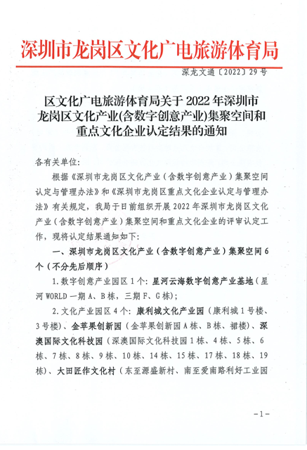 日前,根據(jù)《深圳市龍崗區(qū)重點文化企業(yè)認(rèn)定與管理辦法》有關(guān)規(guī)定,我司通過龍崗區(qū)文化廣電旅游體育局組織開展的2022年深圳市龍崗區(qū)重點文化企業(yè)的評審認(rèn)定工作,正式被認(rèn)定為“深圳市龍崗區(qū)重點文化企業(yè)”。