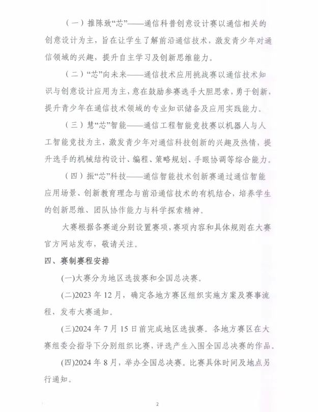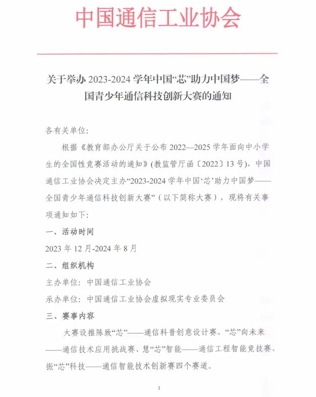 中國“芯”助力中國夢——全國青少年通信科技創新大賽由中國通信工業協會主辦,旨在貫徹落實黨的二十大報告和習近平總書記關于加強基礎研究和科學教育的重要指示精神,響應教育部等十八部門聯合印發的《關于加強新時代中小學科學教育工作的意見》,推動中小學生科學素養和創新能力的提升,培養具有科學家潛質和愛國情懷的優秀人才。