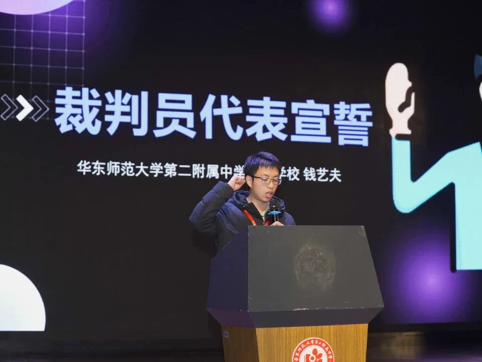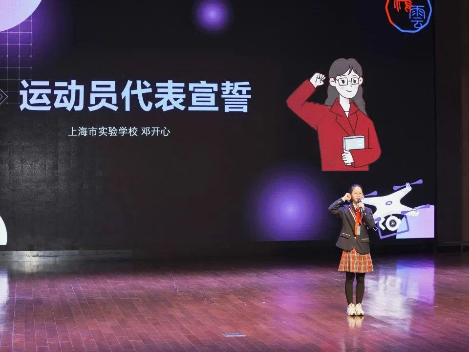 華東師范大學第二附屬中學前灘學校的錢藝夫老師、上海市實驗學校中二年級(3)班學生鄧開心分別代表裁判員和運動員進行了宣誓裁判員代表和運動員代表進行了宣誓